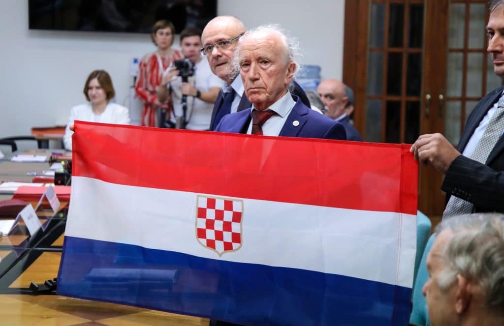Foto: HINA/ Admir Buljubašić/pravaši i zastava s prvim bijelim poljem