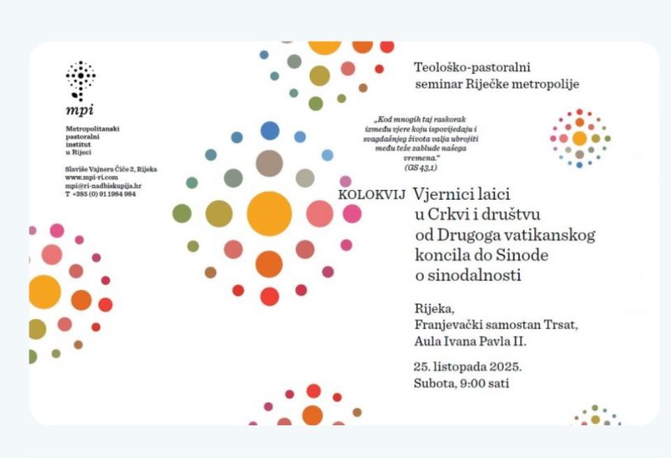 U subotu 25. listopada u Auli svetog Ivana Pavla II u svetištu Majke Božje Trsatske u organizaciji Metropolitanskog pastoralnog instituta u Rijeci održan je Teološko-pastoralni seminar Riječke metropolije s naslovom “Vjernici laici u Crkvi i društvu – od Drugog vatikanskog koncila do Sinode o sinodalnosti”.